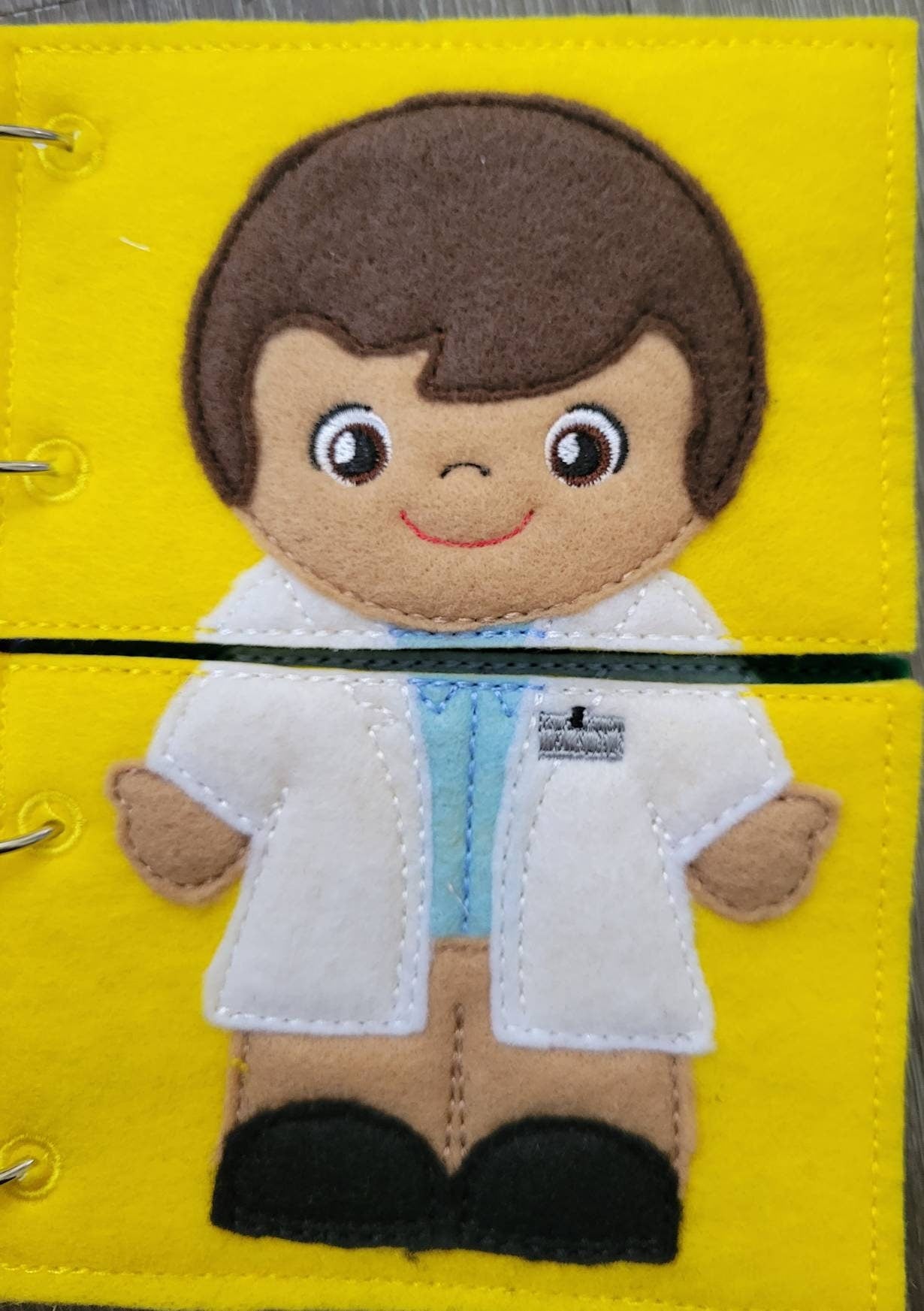 This book includes six activity pages and a personalized front cover. All the pieces in the book are attached to the book with ribbon, and can be stored in the little pocket at the bottom of each page. The book is held together with binder rings.
