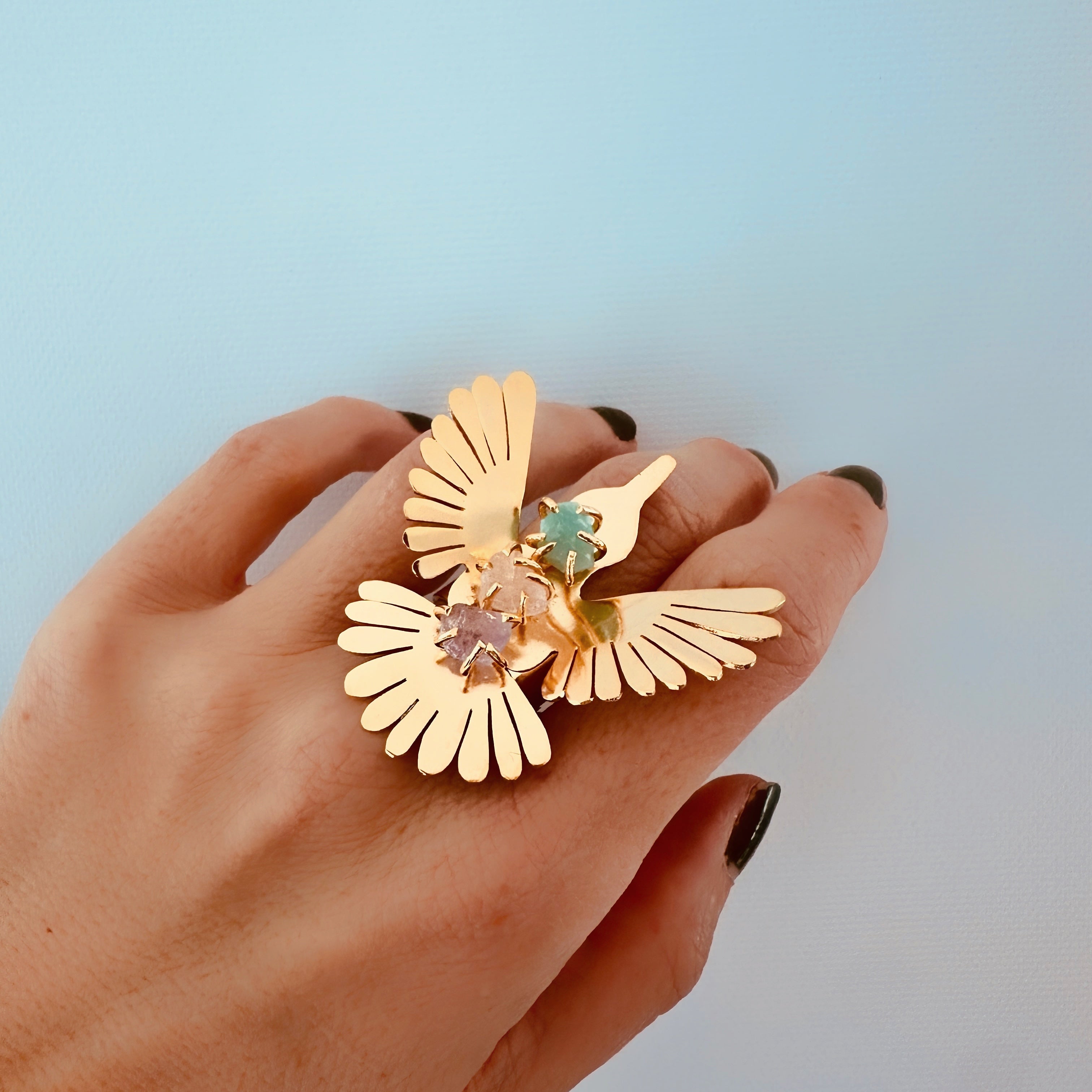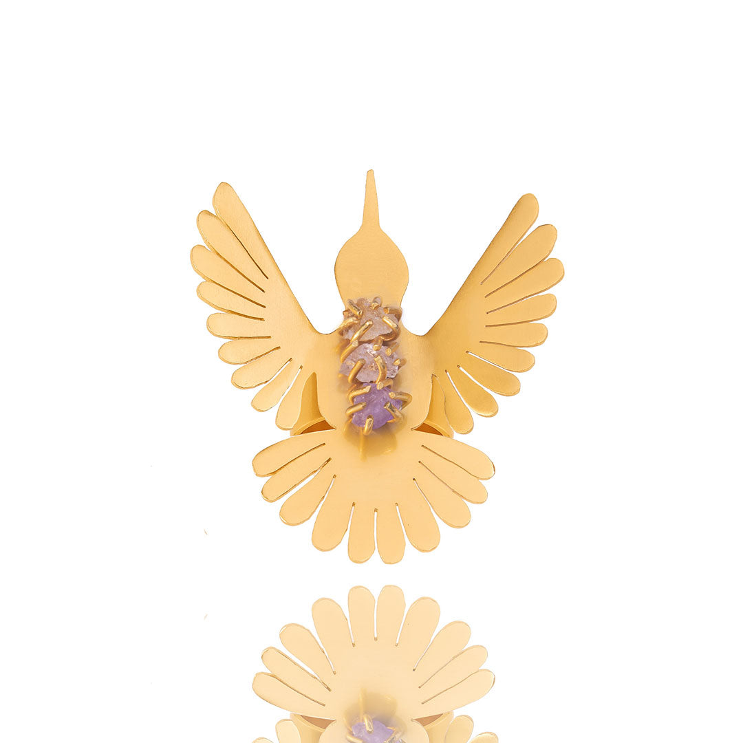 Proudly take flight with our Hummingbird Ring. Its striking design embodies the symbolism of healing, good luck, and hope, as these winged creatures are believed to be messengers from the heavens. Our collection of exquisite Earrings, Rings, Necklaces, and studs, infused with the calming energy of amethyst, will elevate your style and bring serenity to your wardrobe.